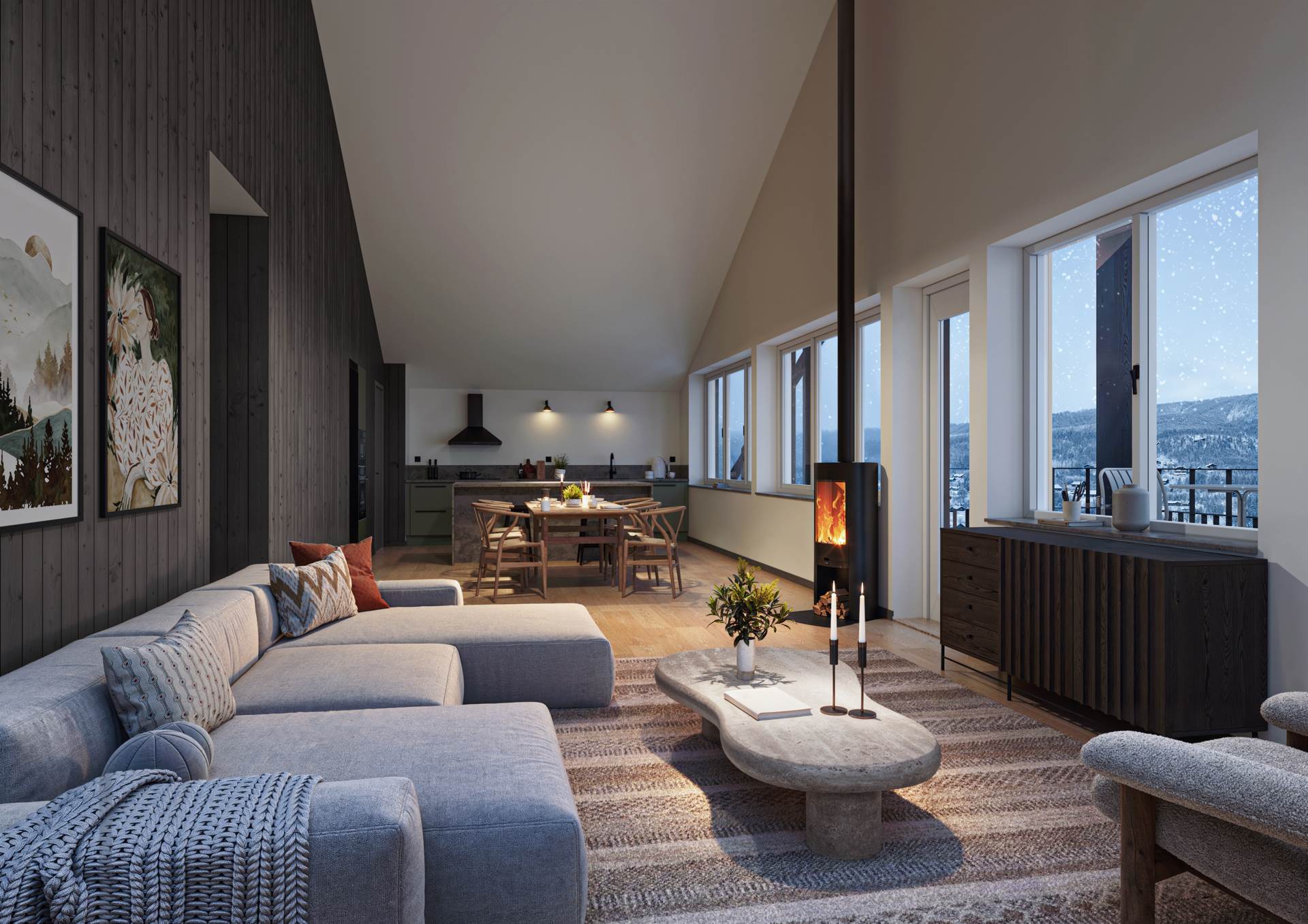 Inspirerat av Härjedalens arkitektur - I Vigelby View möter gedigna material smarta funktioner som underlättar. Välkommen in till rejäla trägolv, stora glaspartier som ramar in den storslagna naturen och långa balkonger längs den svarttjärade fasaden. Byggnaden är anpassad efter marknivåerna och tonas ned av de brutna taket. Här ryms 14 lägenheter i 4 olika storlekar från mysiga studiolägenheter på 32 kvm till maffiga penthouse på hela 113 kvm. Gemensamt för alla lägenheter är öppen planlösning i sällskapsytorna med sammanhängande kök och vardagsrum samt vilsamma sovrum och badrum med bastu, vilket ger ett fjällhem för både umgänge och avkoppling. En annan fördel är att nästan alla lägenheter är hörnlägenheter med utsikt åt två väderstreck. I entréplanet finns förråd till varje lägenhet, möjlighet att torka och tvätta utrustning samt plats till förvaring av skidutrustning och cykel. Helt enkelt ett boende utformat för att underlätta livet på fjället.
